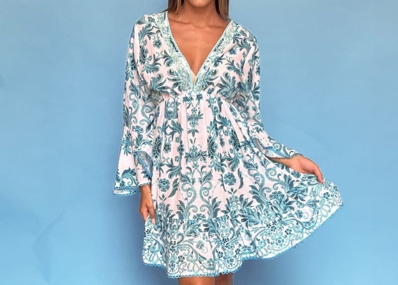 An "Ibiza dress" is a style of dress typically characterized by a loose, airy fit, bright colors and patterns, often featuring bohemian details like lace, embroidery, fringes, or tassels, made from lightweight fabrics like cotton or linen, and designed for a relaxed, summery look, often associated with the carefree vibe of the Spanish island Ibiza; it's perfect for beach parties, festivals, or casual summer wear.